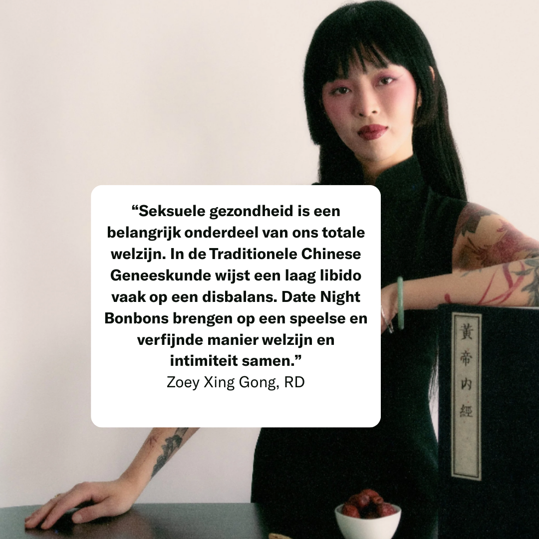 "In de Traditionele Chinese Geneeskunde geldt een laag libido vaak als teken van disbalans in het lichaam. Date Night Bonbons brengen wellness en intimiteit op een speelse en lekkere manier samen, met kruidenextracten die al eeuwen in de TCM worden gebruikt ter ondersteuning van gezondere intimiteit."