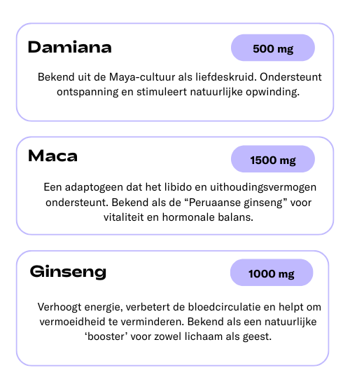 "Uit onderzoek is gebleken dat ingrediënten zoals Maca het seksuele verlangen en de hormoonbalans bij zowel mannen als vrouwen verbeteren."