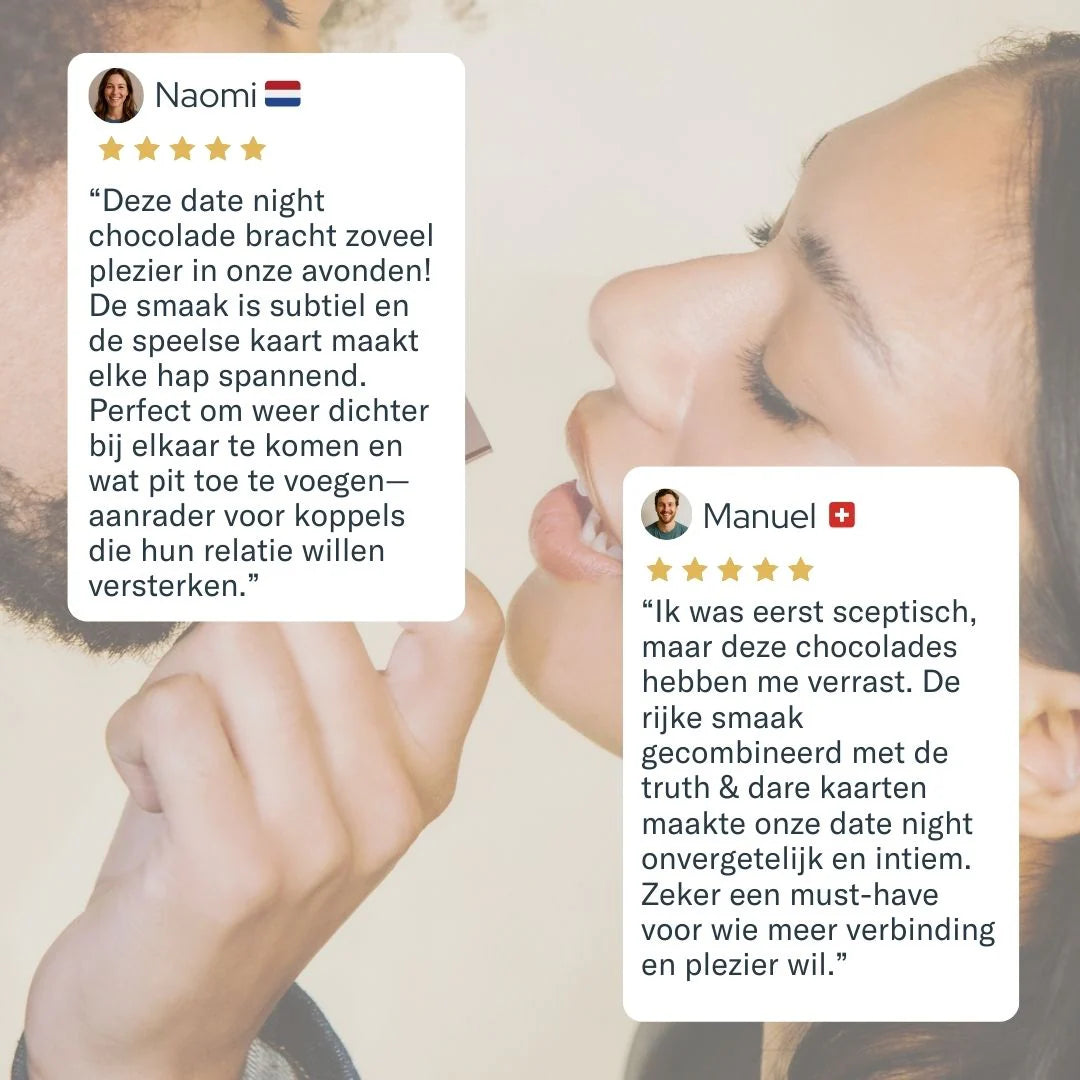 "Dit was zooo leuk en we hebben een geweldige avond gehad! De chocolade smaakt echt heerlijk en de kaart was uitdagend. Ik kan niet wachten tot onze volgende Date Night!"
