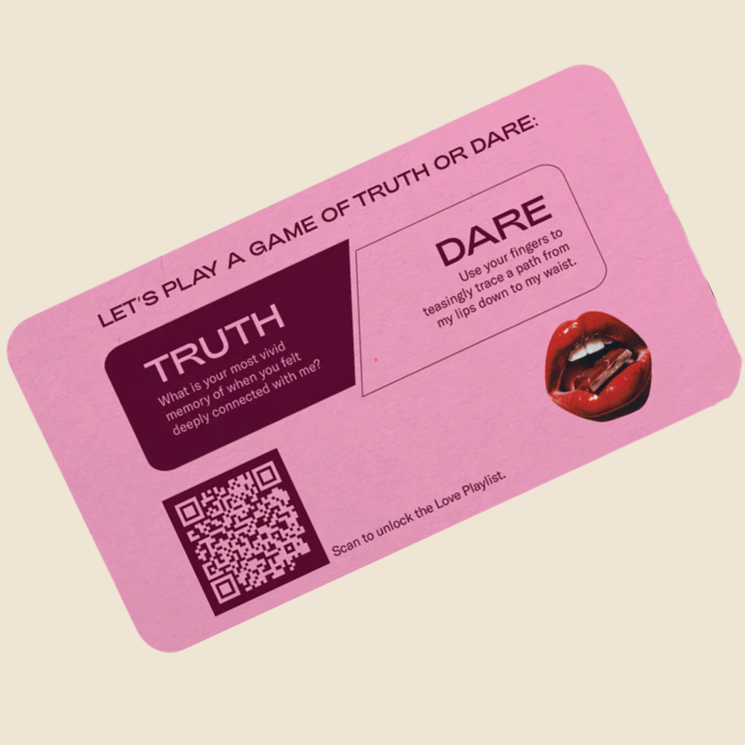 In elke doos zit een unieke spelkaart met een Truth/Dare uitdaging. De QR-code gaat naar Liefdes Afspeellijst en Gratis Erotica.