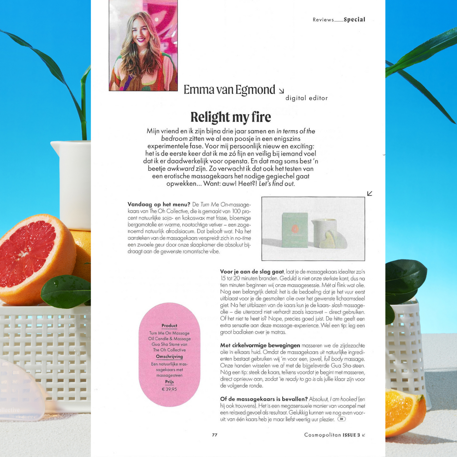 De Turn Me On massagekaars is het perfecte wintercadeau. Vaak gezien in de pers en zelfs met een eigen feature in de Cosmopolitan 2023 November issue.